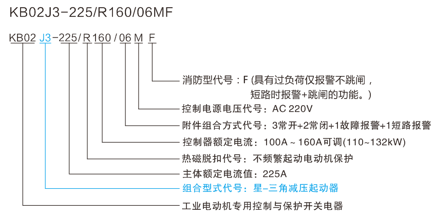 適用于電動機星-三角減壓起動的控制與保護,以KB02產品作為主開關,與塑殼斷路器、可逆接觸器、時間繼電器、電氣聯鎖及控制回路組合構成-三角減壓起動的控制與保護裝置。