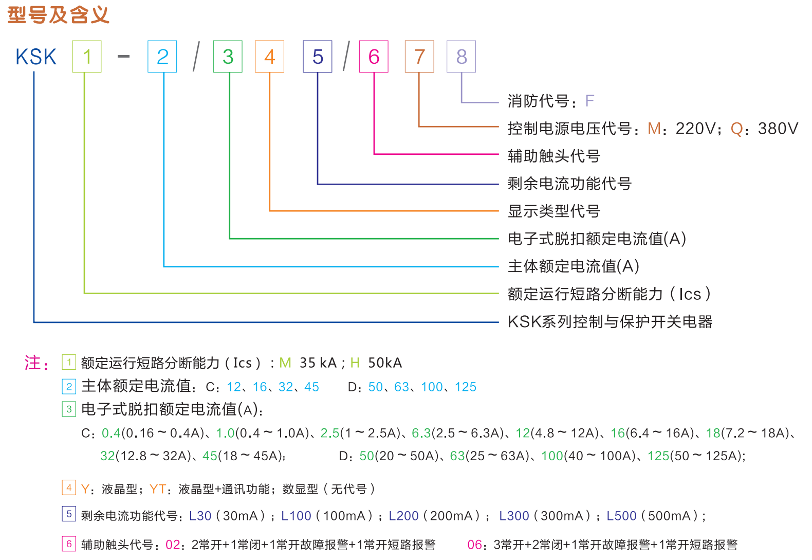 KSK數顯型系列控制與保護開關電器采用了一體化的系統解決方案,在更小的體積內,實現了更強大的功能和性能。產品含斷路器、接觸器及保護器功能;界面帶LED顯示。運行燈、故障燈狀態指示,功能鍵選擇所需整定的功能代號及預置參數值,測試/復位鍵用于測試脫扣器動作狀態和電子復位狀態。顯示鍵用于查看三相電流平均值和A、B、C各相電流、剩余電流、實時電壓、自整定電流及脫扣信息;選擇鍵用于設定確認,在功能鍵設置完成后按此鍵即可選擇并確認。