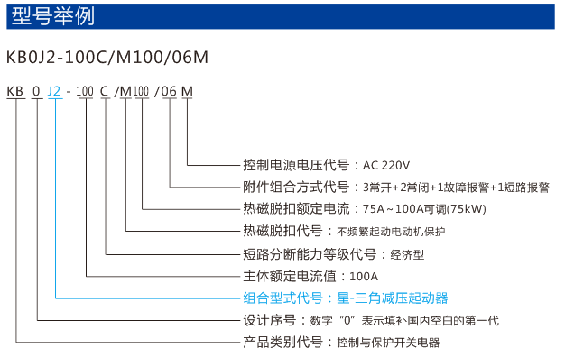 以KB0作為主開關,與適當的時間繼電器、電氣聯鎖、機械聯鎖等附件組合,構成Y-△減壓起動器成套單元KB0J2(以KB0-F消防型產品作為主開關,可構成消防型Y-△減壓起動器成套單元KB0J2-F, 具有過負荷僅報警不跳閘,短路時報警+跳閘的功能。)可實現110kW及以下的電動機的Y-△減壓起動控制與保護。